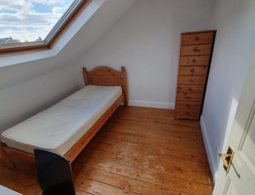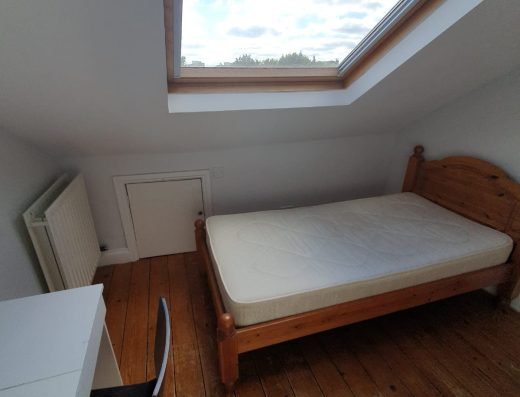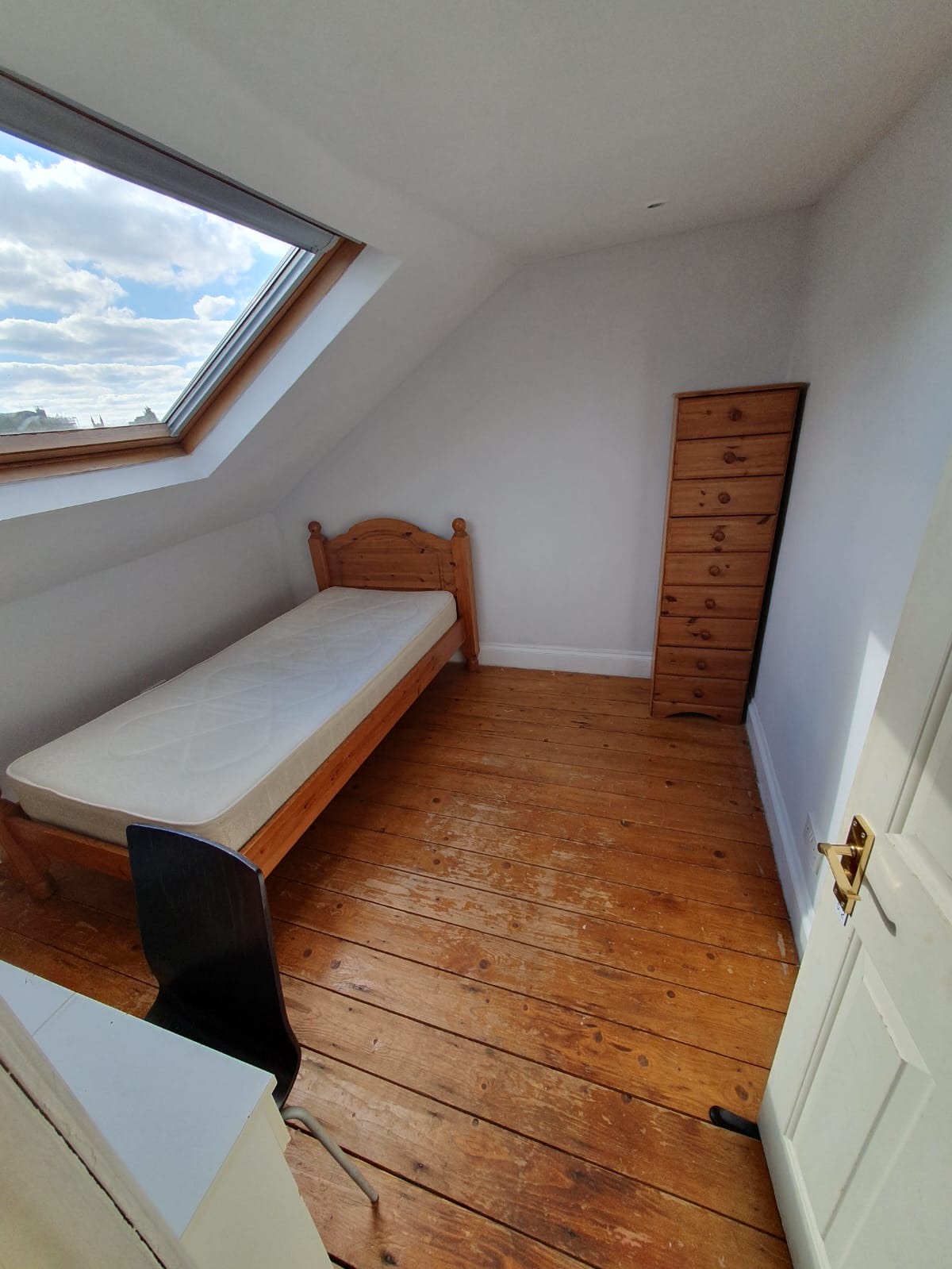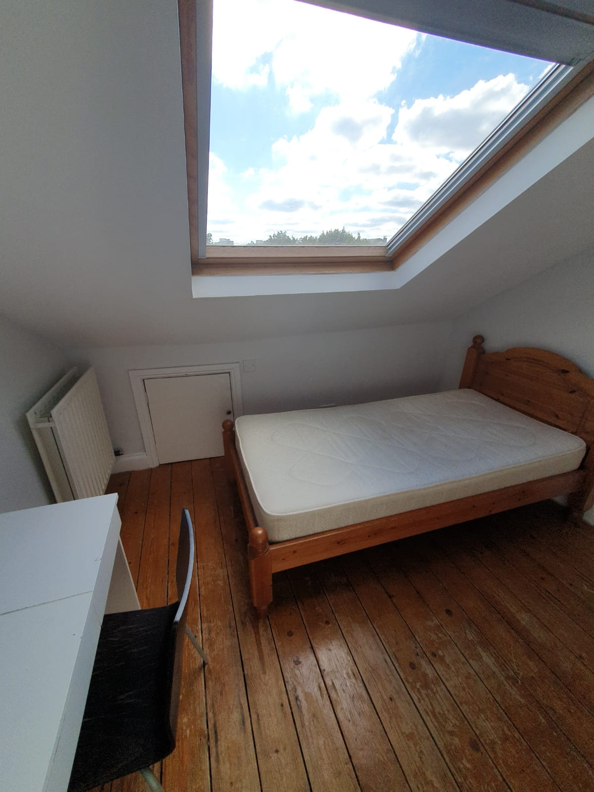 The room is at the back of the house on the top floor, and so is very quiet. It has stripped wooden floors, and large velux window. There is additional storage under the eaves.